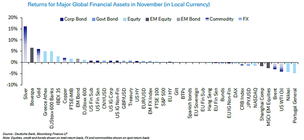 The most crucial structural development in global markets remains the dominant role of AI in the US equity rally. The “Magnificent 7” tech stocks fell 1.1% in November, marking their first monthly decline since March. This came despite strong headline earnings from Nvidia, which fell by more than 12% during the month. Meta also continued to weaken following its October decline, amid concern over the scale and sustainability of its AI-related capex.