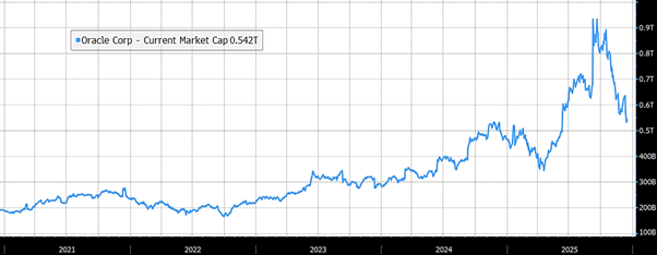 Of note was Oracle, which reported better-than-expected revenue growth from its cloud infrastructure division, yet saw its shares fall sharply as markets questioned the company’s ability to fund its aggressive expansion plans. Recent bond issuance linked to AI infrastructure is now trading closer to high-yield levels, and the cost of insuring Oracle debt jumped 45% in November. This serves as a warning that the AI capex cycle may not deliver the returns investors are banking on, particularly given the rapid pace of technological change and potential supply-demand mismatches in the data centre market. The dramatic fall in the market cap of Oracle is shown below: